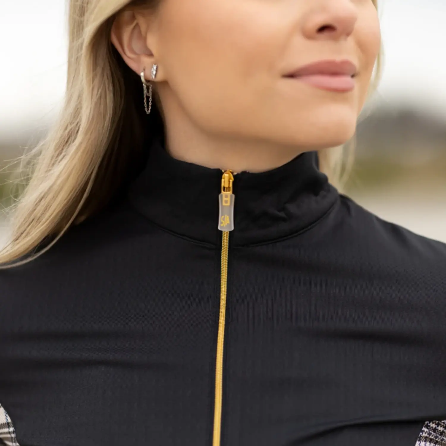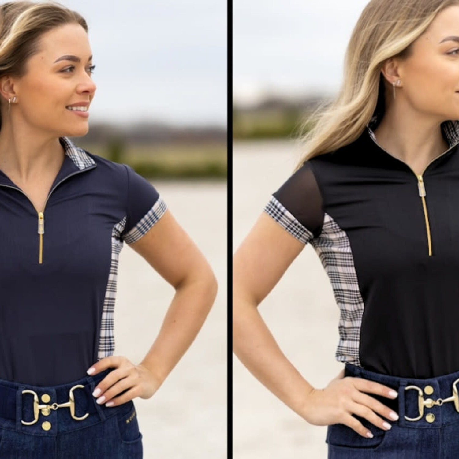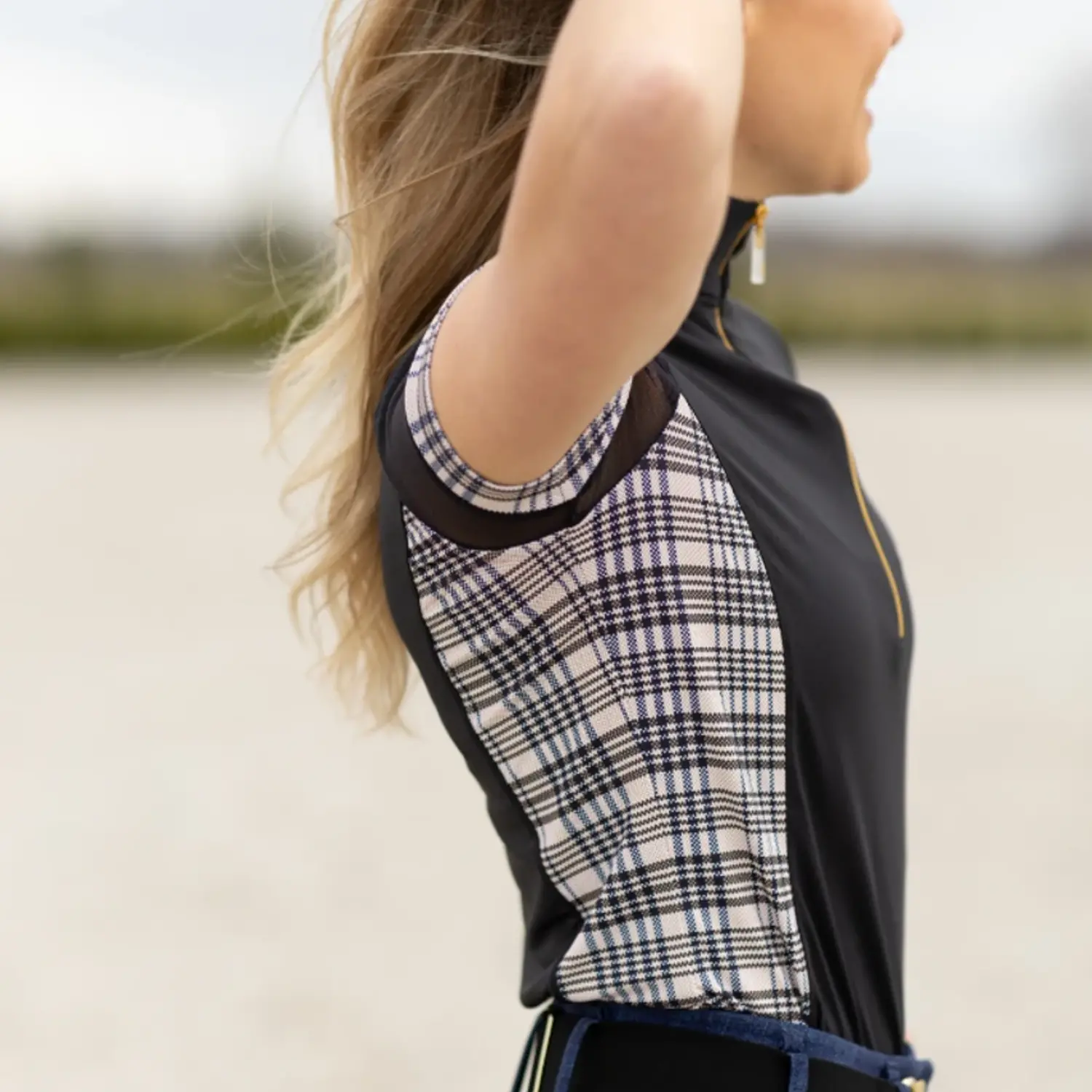 Black Mesh Short Sleeve: features the iconic 5/A Baker® plaid and a full mesh cap sleeve for breathability. So chic! The historic Baker® logo is embroidered at the top back of the shirt and it features a 5/A Baker® branded zipper pull. With a deep quarter-zip and flattering lines, this shirt really highlights your equitation.