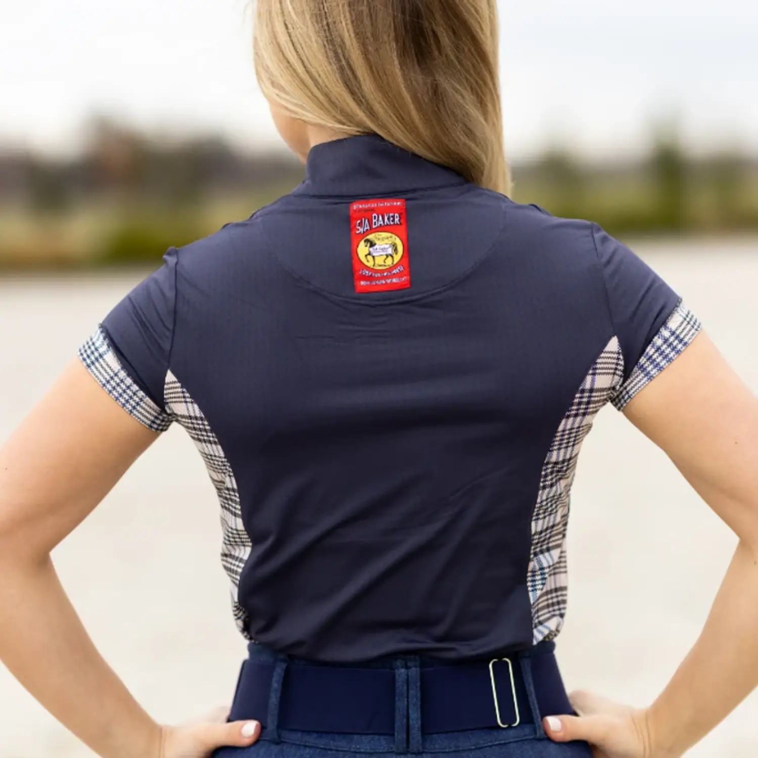 Navy Short Sleeve (no mesh): Features the iconic Baker® plaid and an adorable cap sleeve. The famous woven red Baker label is at the top back of the shirt and it features a 5/A Baker® branded zipper pull. With a deep quarter-zip and flattering lines, this shirt really highlights your equitation.