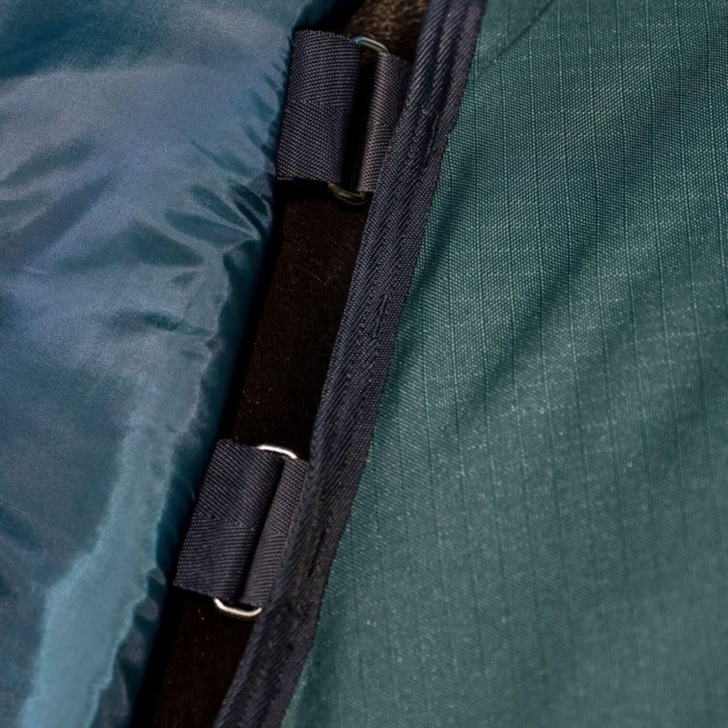 The Amigo® Ripstop 900D Plus Turnout 100g includes fiberfill insulation, a shine-enhancing anti-static and anti-bacterial polyester lining, two cross surcingles, optional leg strap loops, and a tail strap to ensure a secure fit, regardless of your horse's activity level.