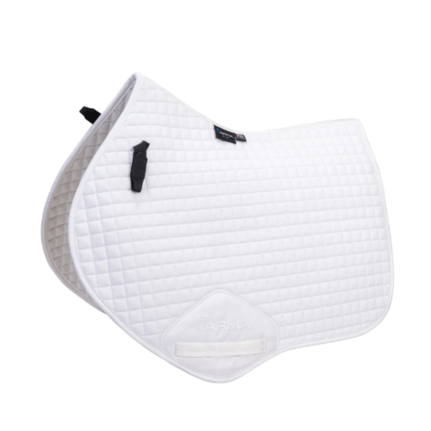 The ARMA deluxe cotton jump saddlecloth offers understated luxury with enhanced under saddle comfort. The timeless small square quilt feels chic, cotton looks smart and wears well. The contoured shape gives good clearance under the saddle gullet. BREATHABLE stay-smart anti-pill 100% cotton outer. ULTRA DRI ZONE lining instantly wicks sweat from the horse to reduce the risk of rubbing and increase comfort. Hardwearing ARMA contour pro girth guard protects heavy wear areas. Jacquard logo tape at the spine, girth loops and elasticated D-ring straps. Finished with a smart self-colour trim.