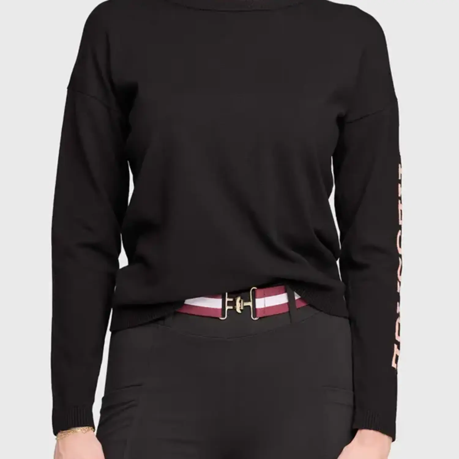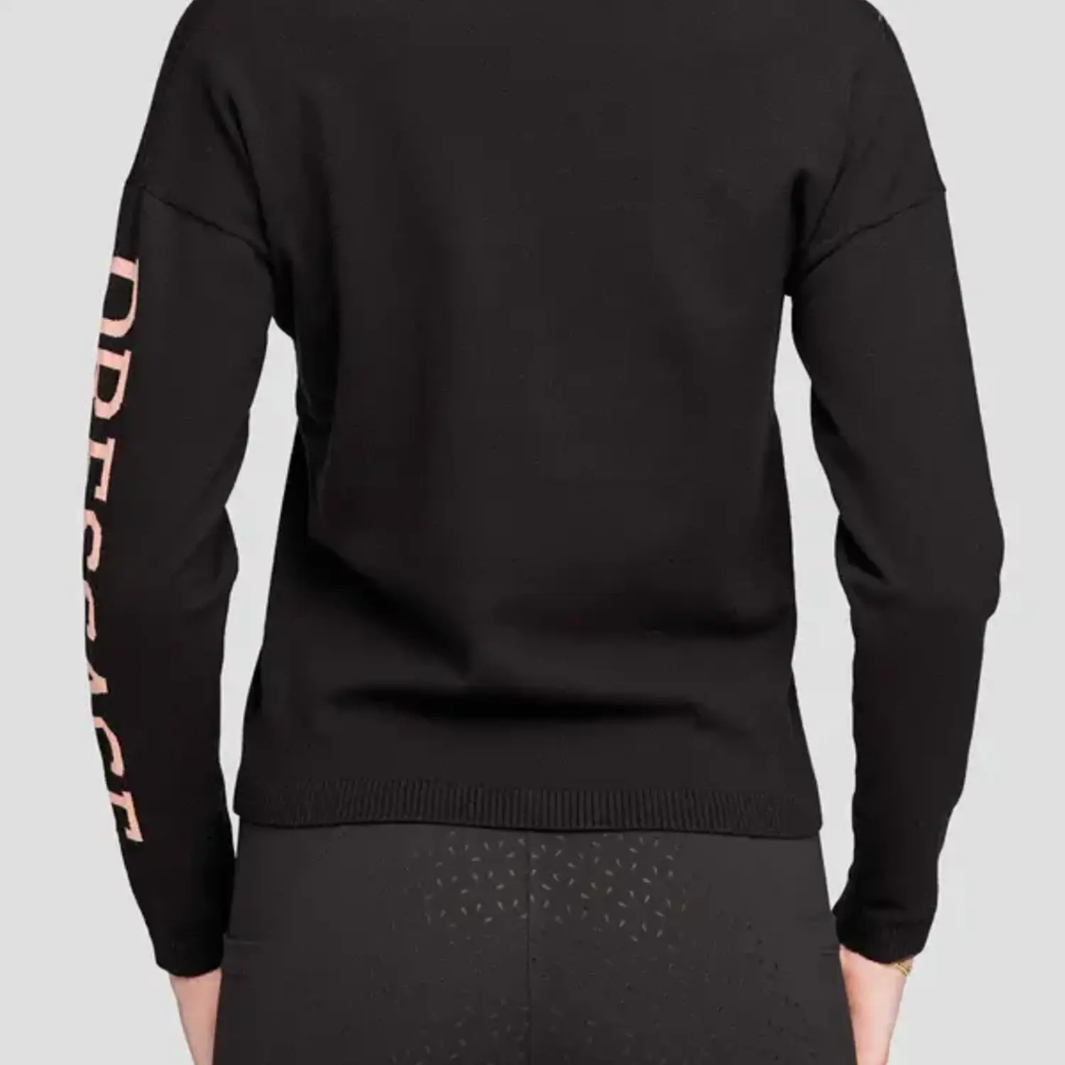 Our super soft, drop shoulder seam crewneck medium weight sweater in rich black features “dressage” in soft blush down the left sleeve. Worn as a layering piece over your favorite ¼ zip or by itself, this is your next cozy go-to piece.