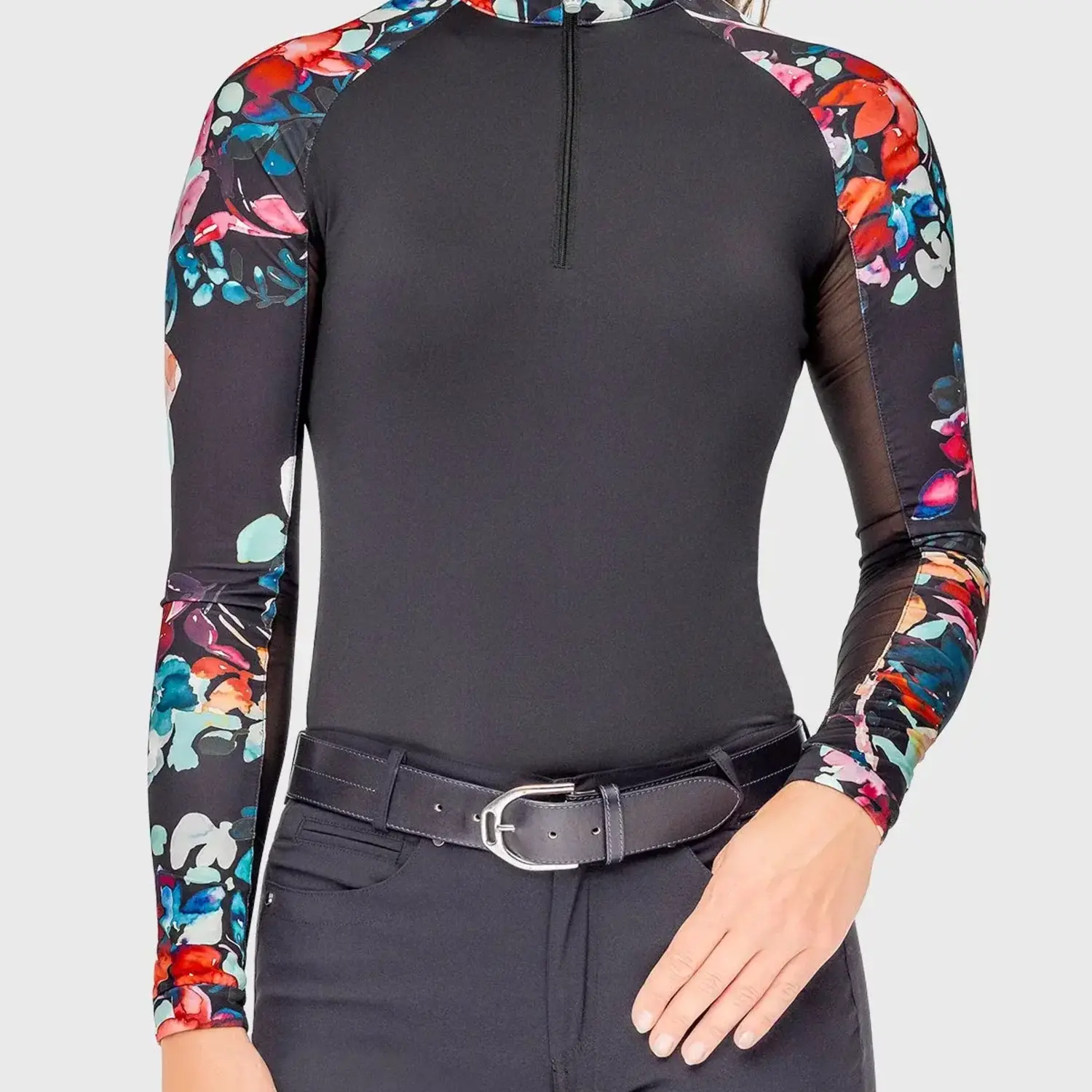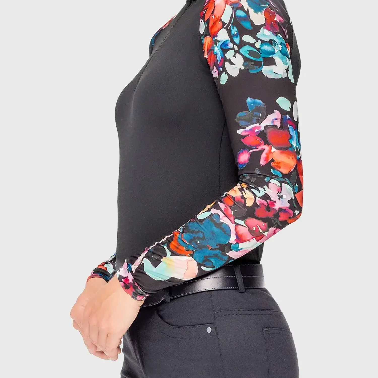 Our athletic silhouette features our signature watercolor floral in rich reds, burgundy, teal and navy with a sleek black ground and flattering black bodice. Long sleeves, ¼ zip, UPF 30, breathable power mesh and soft 4-way stretch fabric in a contemporary fit.