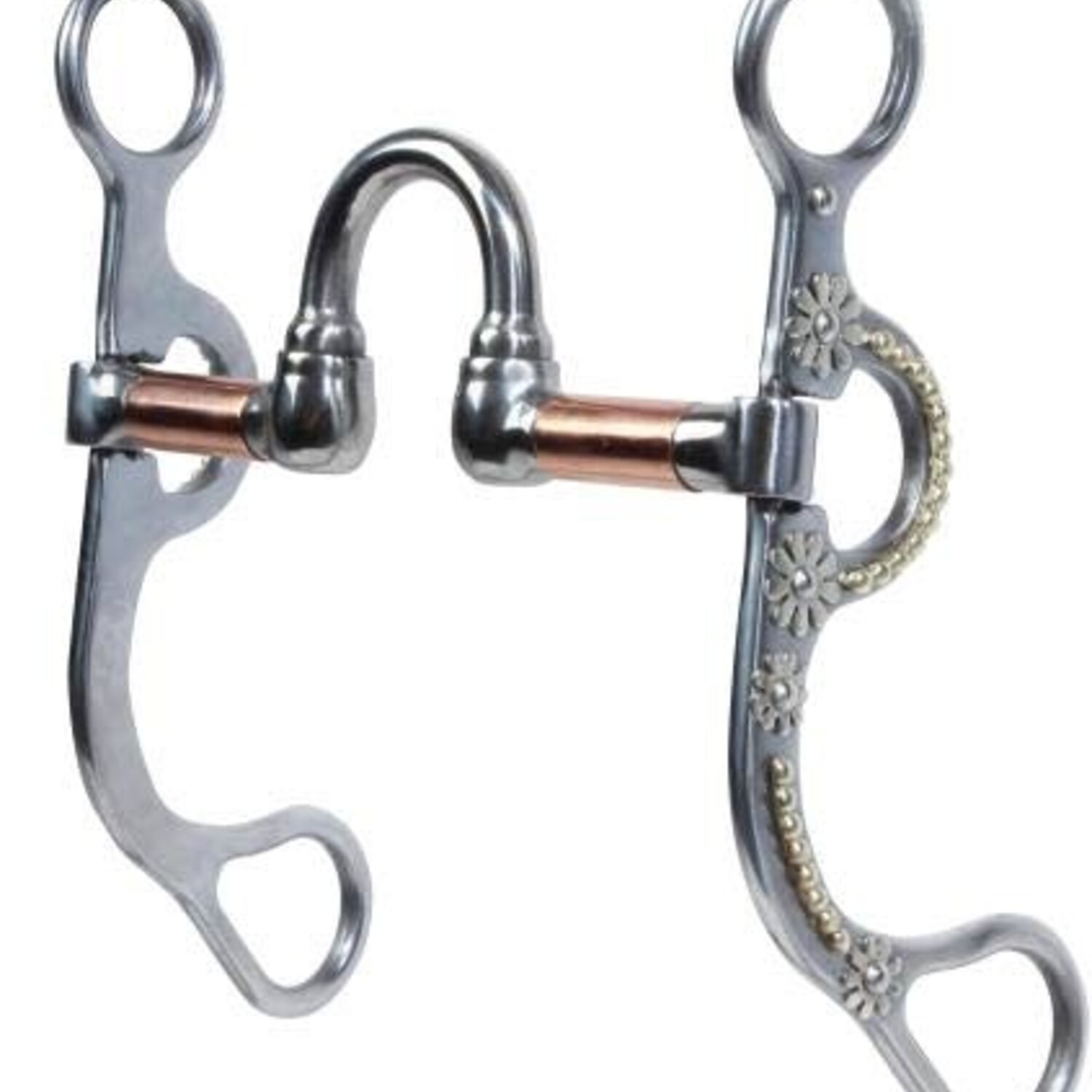 This is a very useful bit with this little shank that offers just enough leverage to connect with your horse but not intimidate him. The correction mouthpiece here is among our most popular as it offers a great deal of lateral movement and control. Beautiful daisy design on the shank completes this bit. 6" shank, 5" mouthpiece, 2" port.