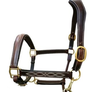 Fully Adjustable Leather Halter, padded and fully adjustable with brass hardware and heavy duty snap. Available in Black or Brown Sizes: Pony (3/4"), Cob (1"), Full (1"), XL (1") Pony is 3/4" leather. Cob, full, and XL are 1" leather.