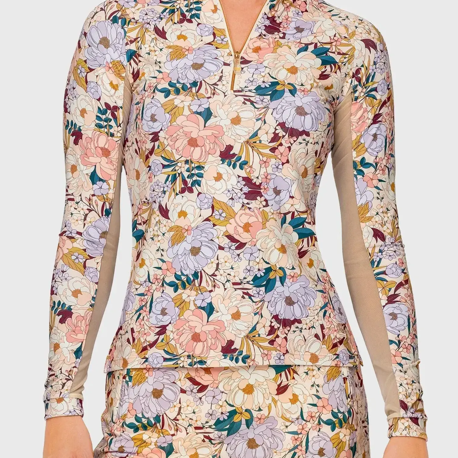 Lovely shades of peach, soft coral, lavender, teal and wine define our peony print this season; Long sleeves, rose gold ¼ zip, UPF 30, breathable power mesh and soft 4-way stretch fabric in a contemporary fit.