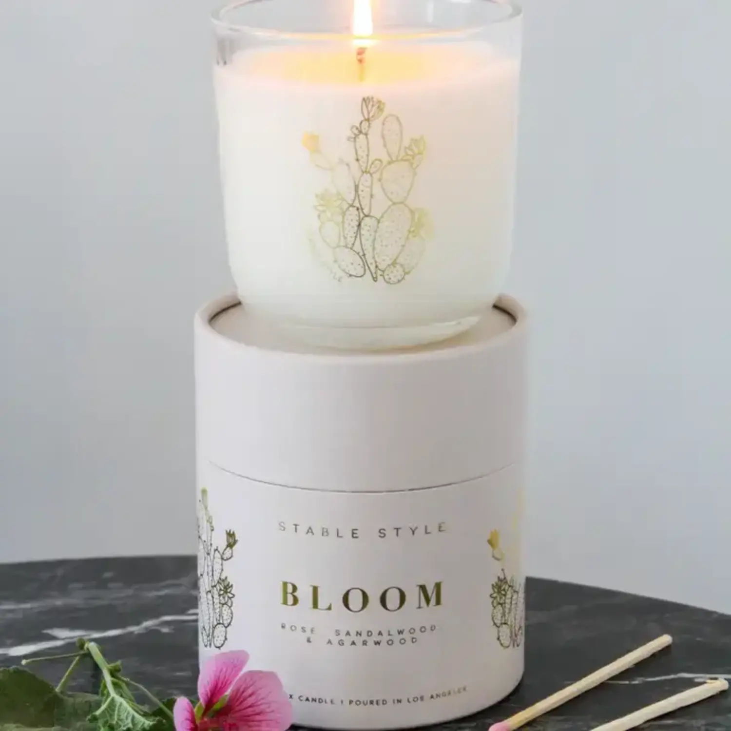 Introducing the Icons Collection by Stable Style—soy wax candles hand-poured into clear glass vessels with graceful rounded bases and accented by gold details.