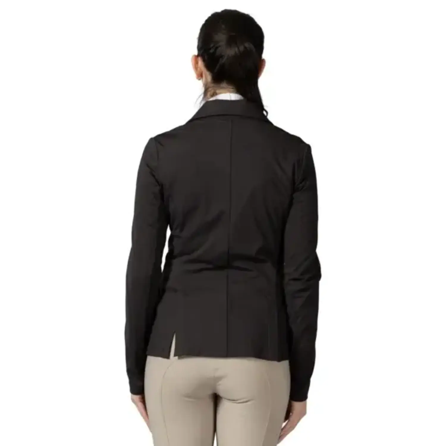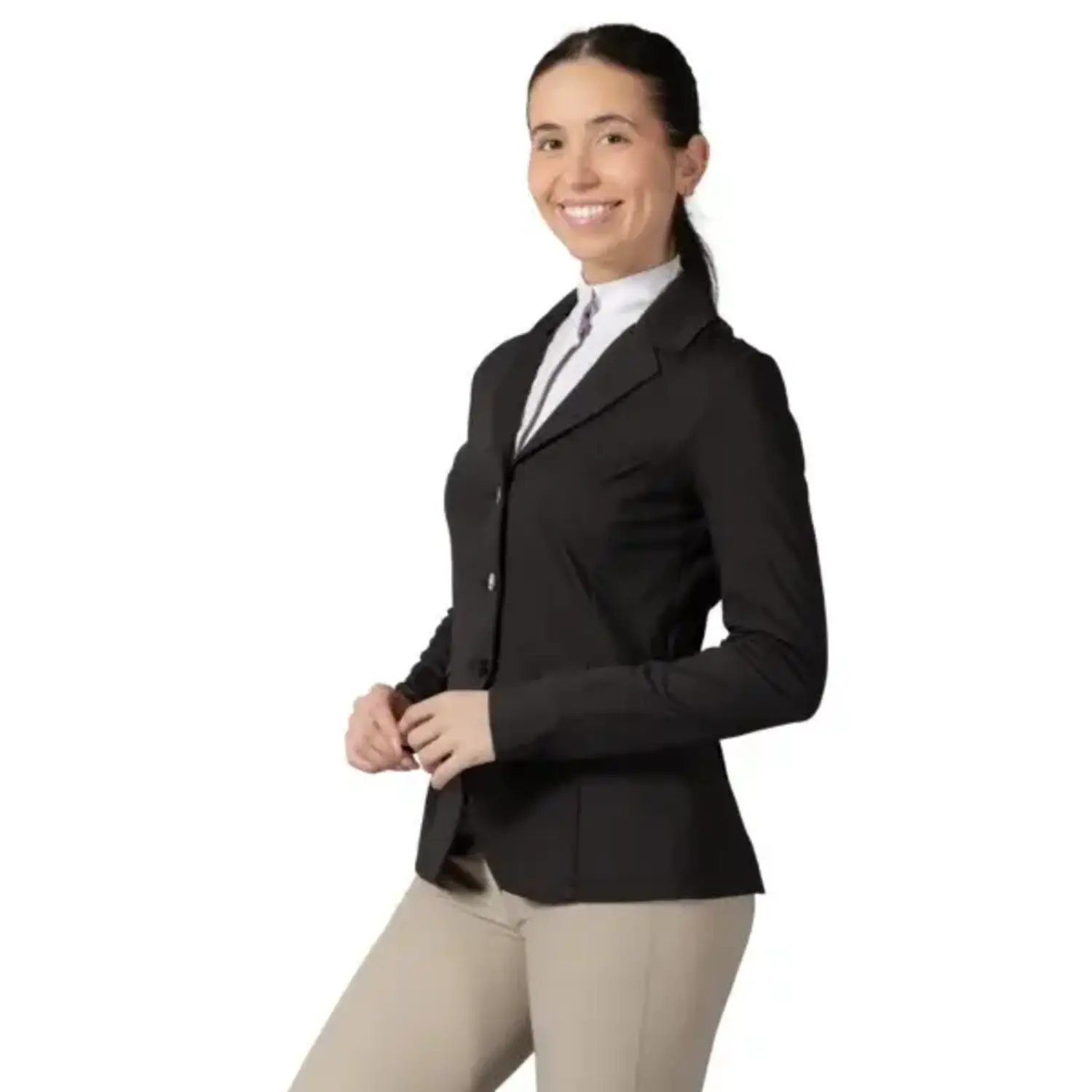 The Equinavia Kristi Women’s Lightweight Show Coat is meticulously crafted from breathable Airsoft fabric for ultimate warm-weather comfort. This high-performance jacket features 4-way stretch integrity that moves with your body, ensuring a non-restrictive, figure-flattering fit in the saddle. With a classic three-button front, double-vented back, and streamlined zip pockets, it delivers a professional silhouette without the bulk. Choose this sophisticated, lightweight coat for a polished show-ring appearance that prioritizes both style and athletic mobility.