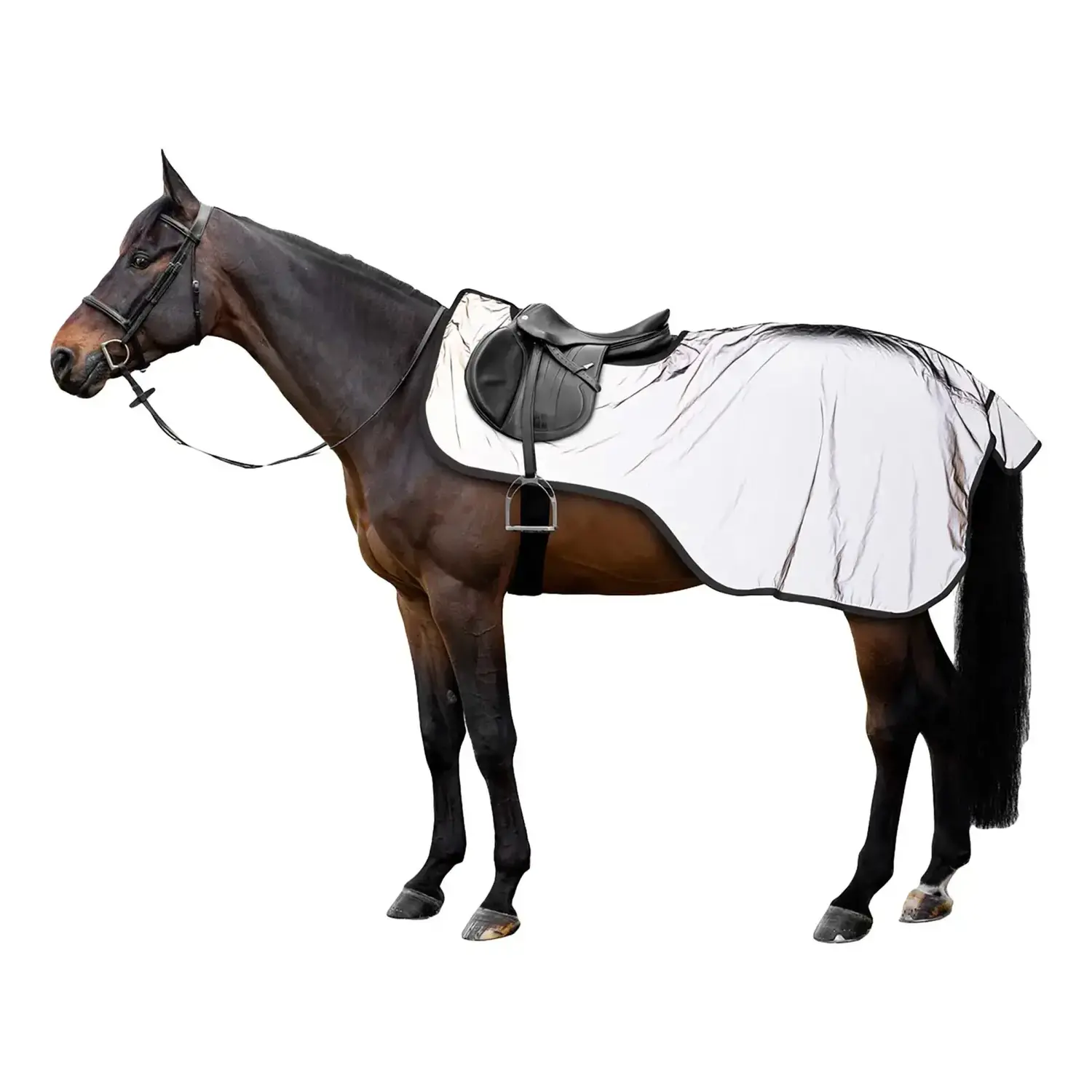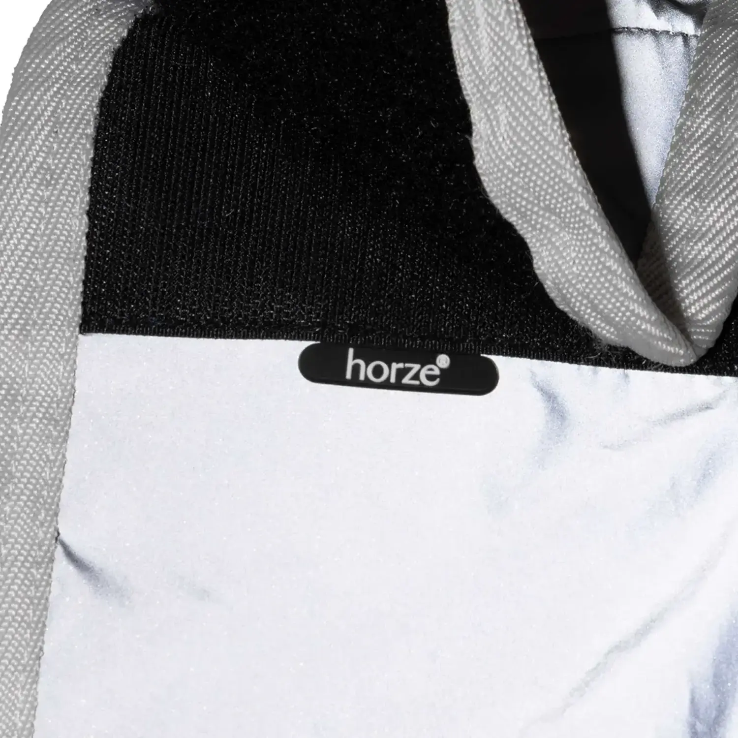 The Horze Hi Viz Reflective Riding Sheet is designed for maximum visibility and safety, featuring reflective high-visibility fabric with bold logo stripes, a practical touch tape closure in front of the saddle, durable poly-cotton twill under the saddle for comfort, and a secure tail rope for stability while riding.