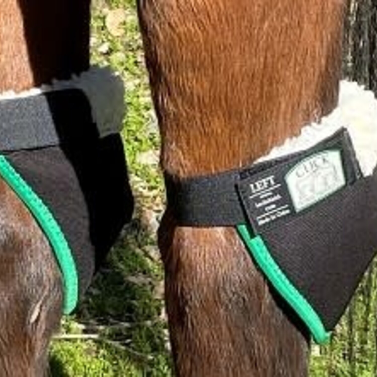 The low profile design offers full coverage in the area where horses develop sores. The soft, flexible pocket in the center back of the Hock Shield provides comfort in the delicate area where the tendons pass just under the skin. This is the perfect solution for the majority of horses with hock sores. Now available in two adjustable sizes