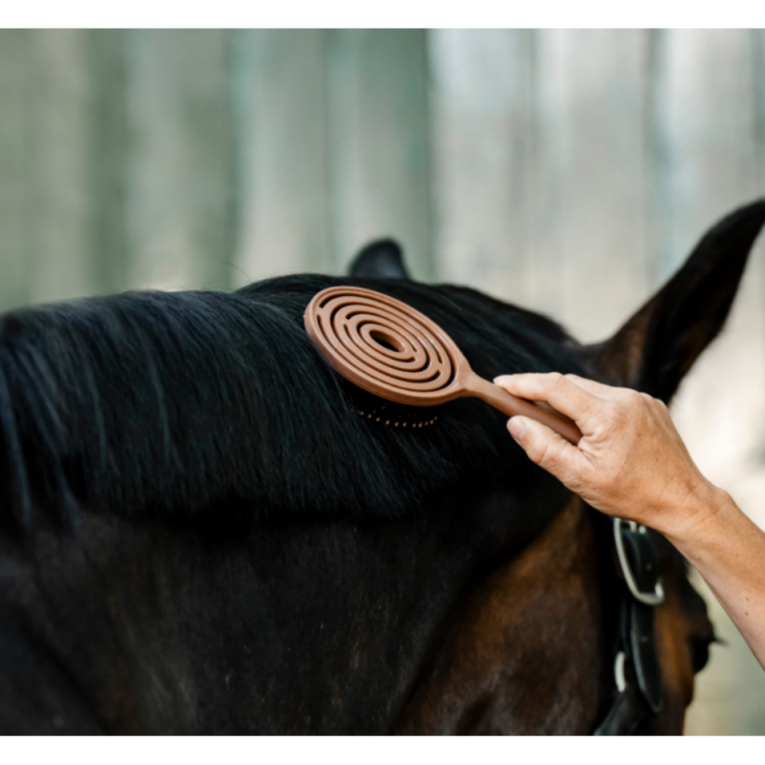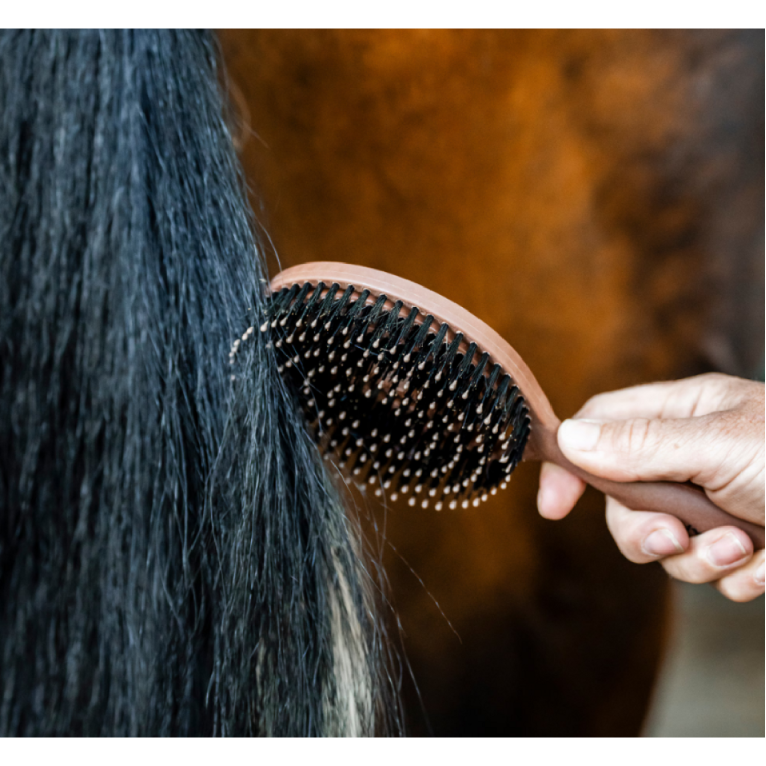 The carefully balanced combination of natural boar bristles and nylon bristles allows the brush to glide smoothly through the hair, removing knots while polishing and smoothing the hair shaft. This dual-bristle design helps distribute natural oils evenly, leaving the mane and tail soft, manageable, and naturally shiny.