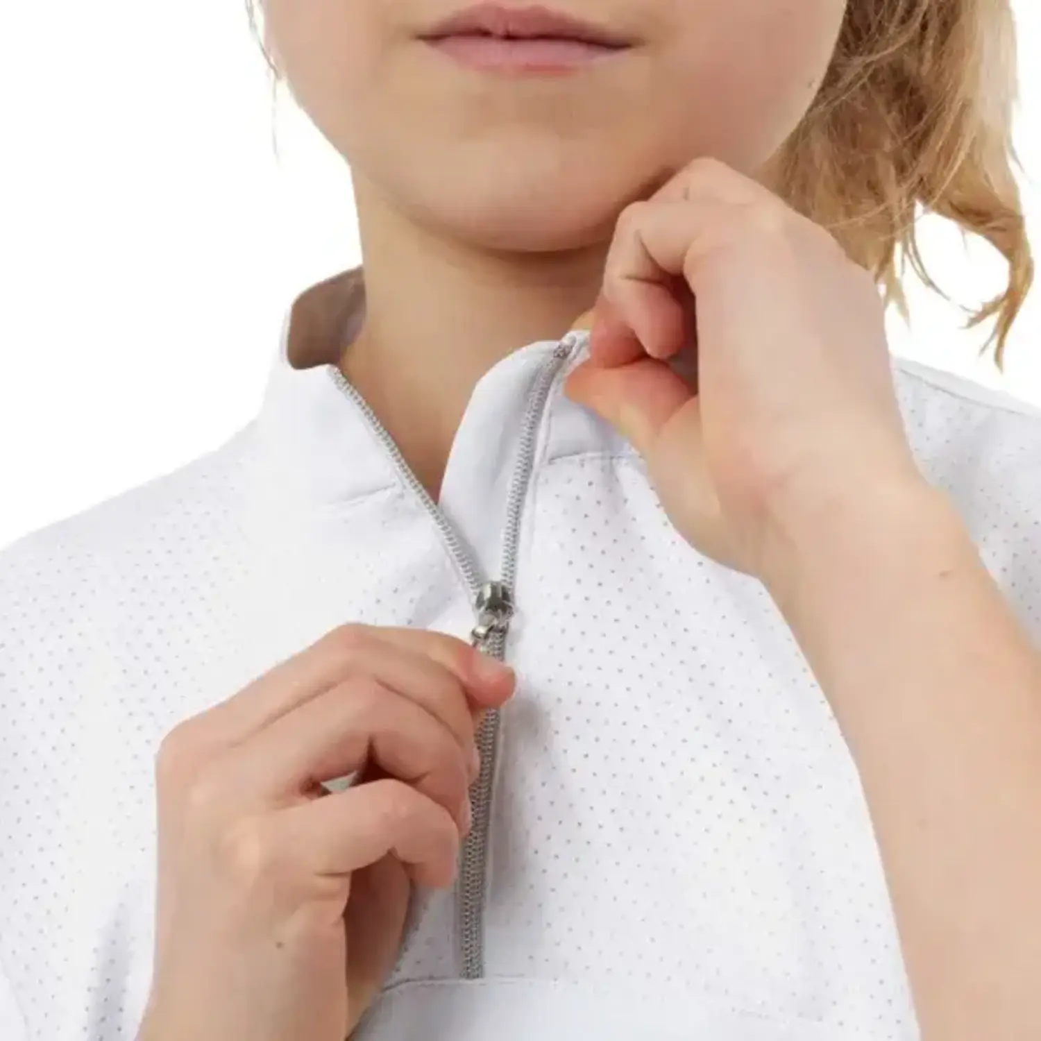 The Horze Louisa Kids Mesh Show Shirt, designed for maximum ventilation during high-pressure competitions, features strategic perforated areas at both the front and back, allowing for superior airflow when worn under a show jacket. The elegant stand-up collar and functional 1/4 zip provide a traditional formal look, while the charming bit-style zipper puller adds a unique equestrian touch. Lightweight and breathable, the Louisa is the perfect choice for maintaining a professional appearance during warm-weather shows.