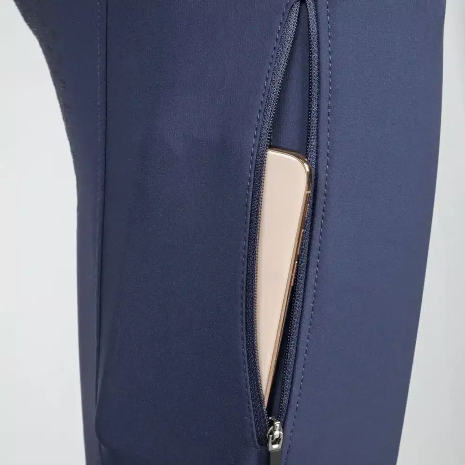 The breeches have two regular front pockets with mesh lining and one vertical mobile phone pocket on the thigh with a zipper.
