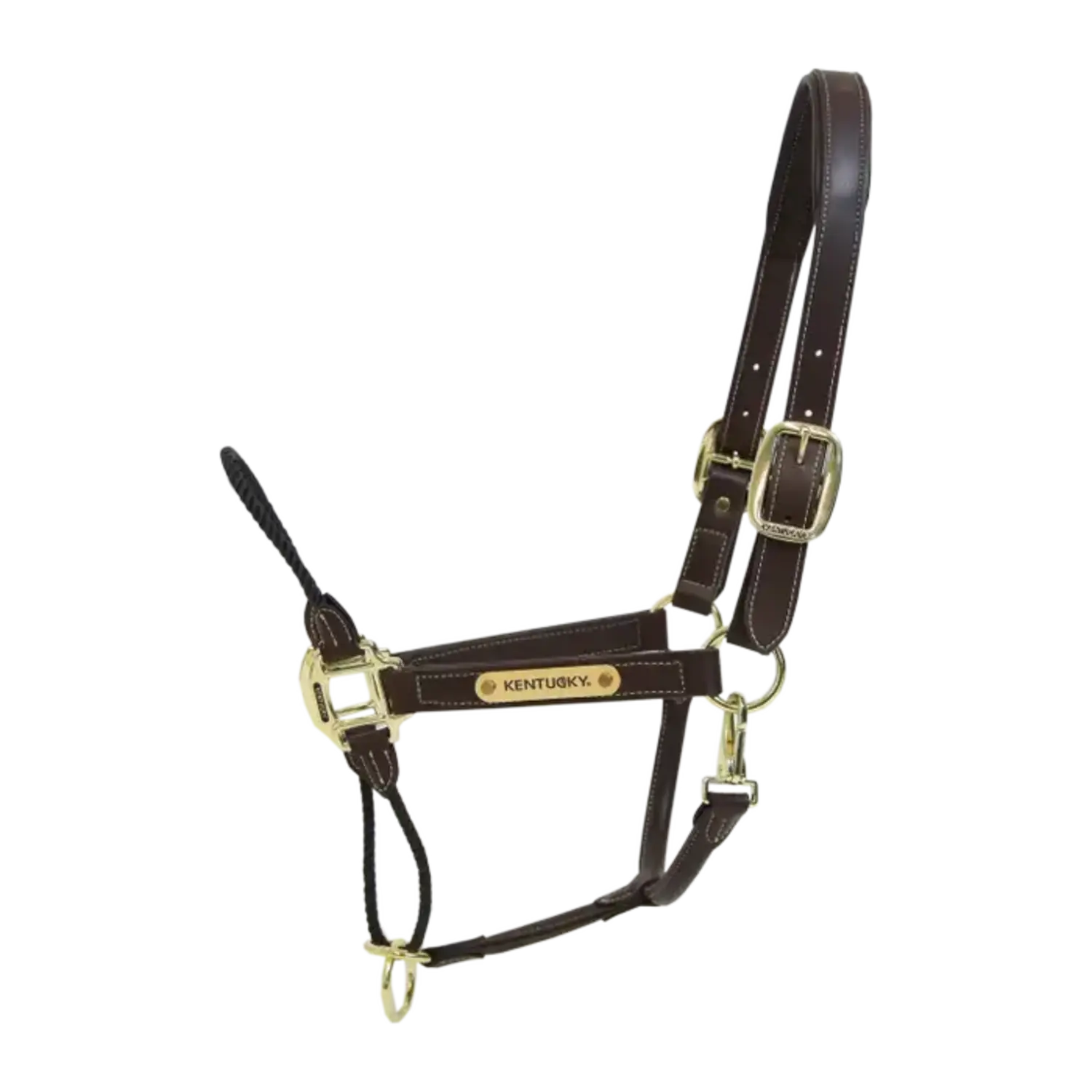 The other pieces of this halter are made of artificial leather that is sustainable, easy to clean and 100% animal friendly. All the buckles are gold to match our leads. The halter comes with a name plate with our Kentucky logo that can be turned over and engraved.