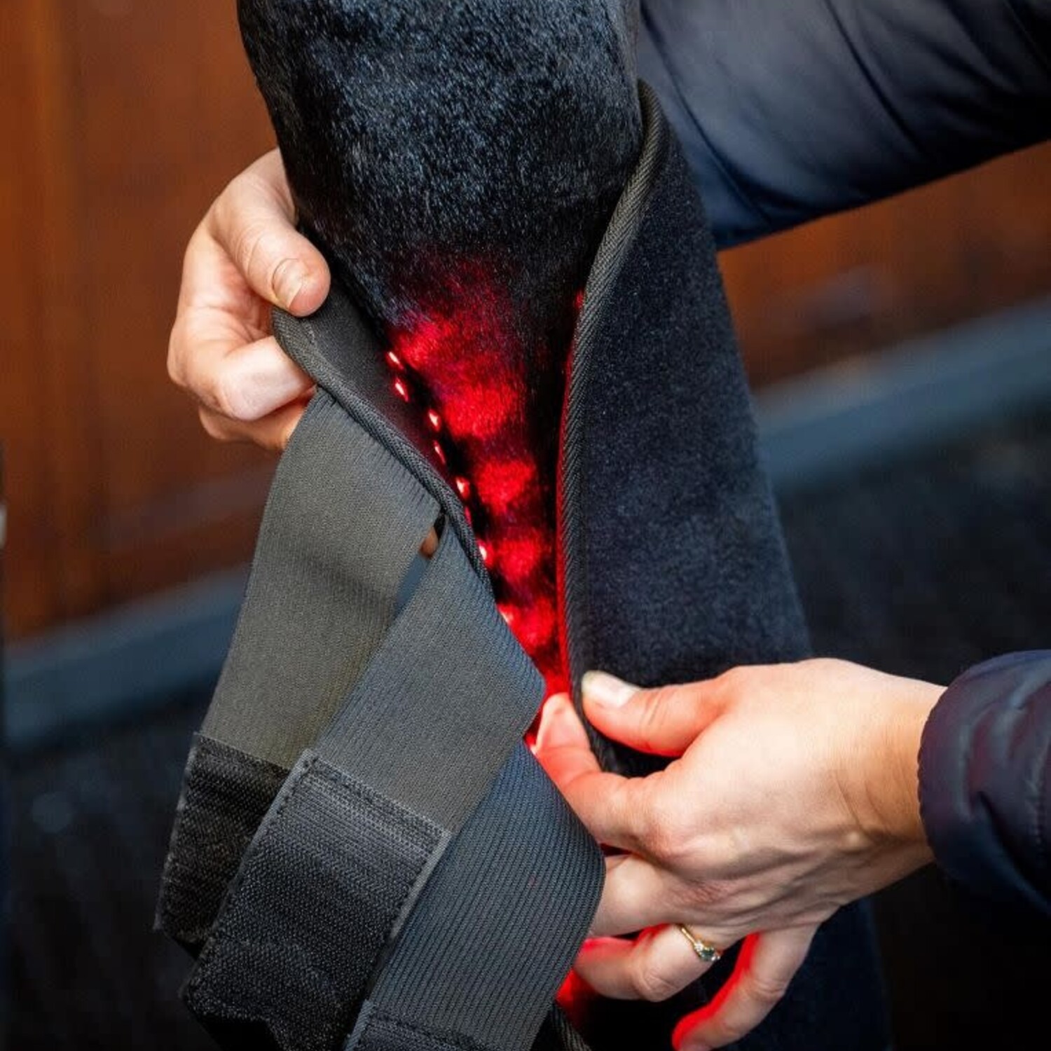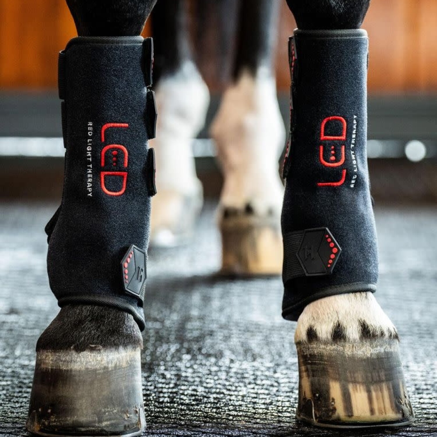 The Horseware® LED Red Light Therapy Leg Wrap offers advanced technology designed to support soft tissue health and post-exercise recovery. 110 LEDs use a combination of different light wavelengths to target both the dermal layer and deep tissues. 660nm red light targets the surface, while 850nm infrared penetrates deeper to reach soft tissue. LED treatment has been shown to increase blood flow and promote cellular activity, which may reduce inflammation, may aid skin conditions, and may accelerate wound healing.