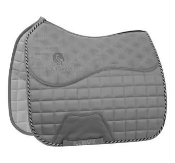 The Equinavia Lillehammer Memory Foam All Purpose Saddle Pad features memory foam in the saddle area, enhanced with a silicone print to prevent slipping. It includes a mesh spine for improved air circulation and a large girth patch that adds extra grip and reduces wear. The pad also has a girth loop and a waffle tricot backing for added comfort. Elegant twisted cord trim completes the look.