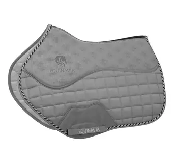 The Equinavia Lillehammer Memory Foam Dressage Saddle Pad features memory foam in the saddle area, enhanced with a silicone print to prevent slipping. It includes a mesh spine for improved air circulation and a large girth patch that adds extra grip and reduces wear. The pad also has a girth loop and a waffle tricot backing for added comfort. Elegant twisted cord trim completes the look.