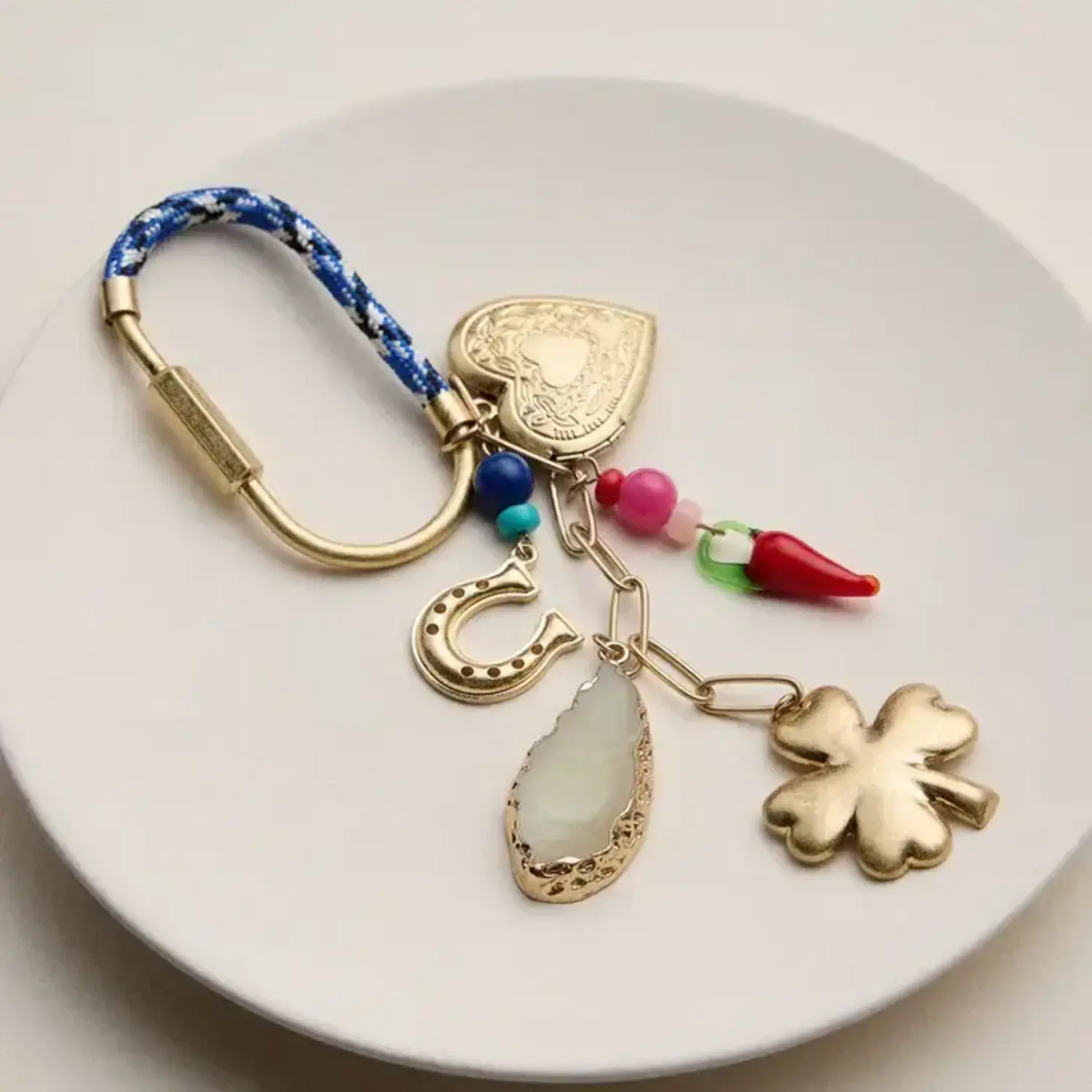 Charms: Four-leaf clover, horseshoe, heart locket, chili pepper, geode-style pendant Strap: Blue and white woven loop with sturdy clasp