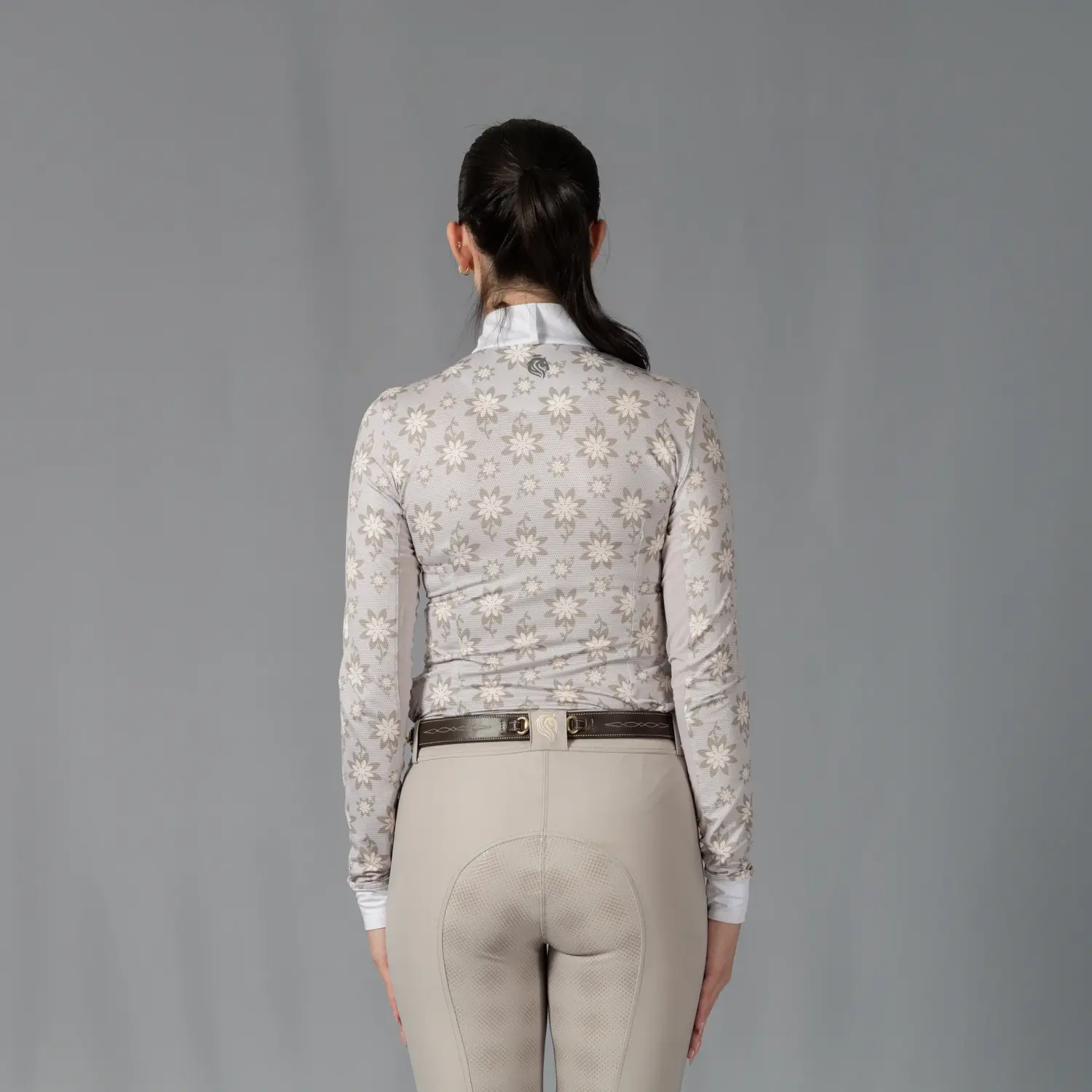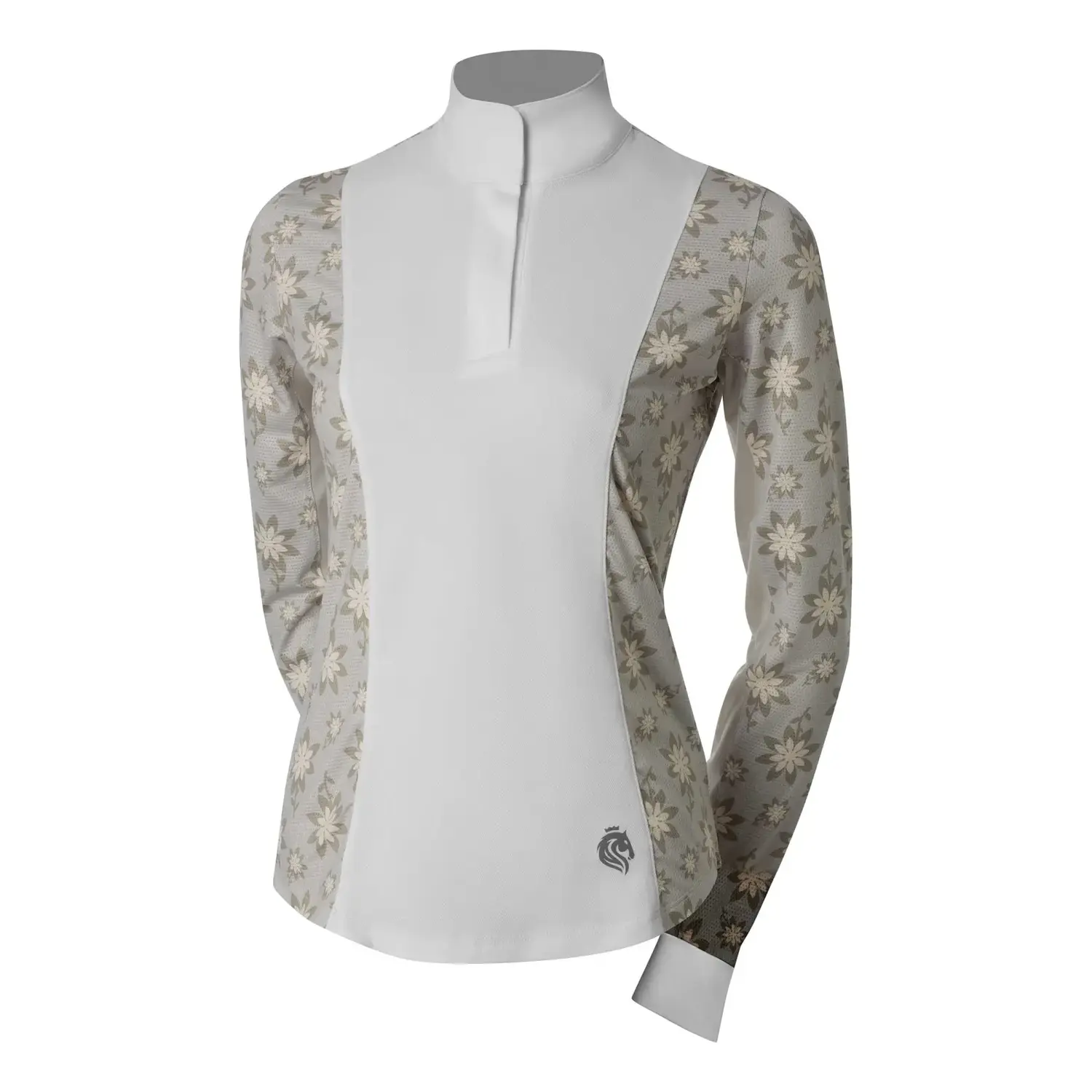 The Martha Long Sleeved Shirt is thoughtfully designed for riders seeking both style and comfort, especially when competing in the show ring. Made with a lightweight and breathable perforated mesh back, this shirt ensures optimal ventilation, keeping you cool during intense rides. The front, cuffs, and collar are crafted from solid white fabric to maintain a traditional, polished look when worn under a show coat. A fitted silhouette with a contoured hem provides a flattering, tailored appearance. The shirt’s pull-on cuffs eliminate the hassle of dealing with buttons or snaps while wearing riding gloves. With a discreet half-inch zipper placket and hidden snap collar, the shirt remains sleek and professional. A stock tie loop at the back adds a thoughtful detail for easy stock tie attachment.