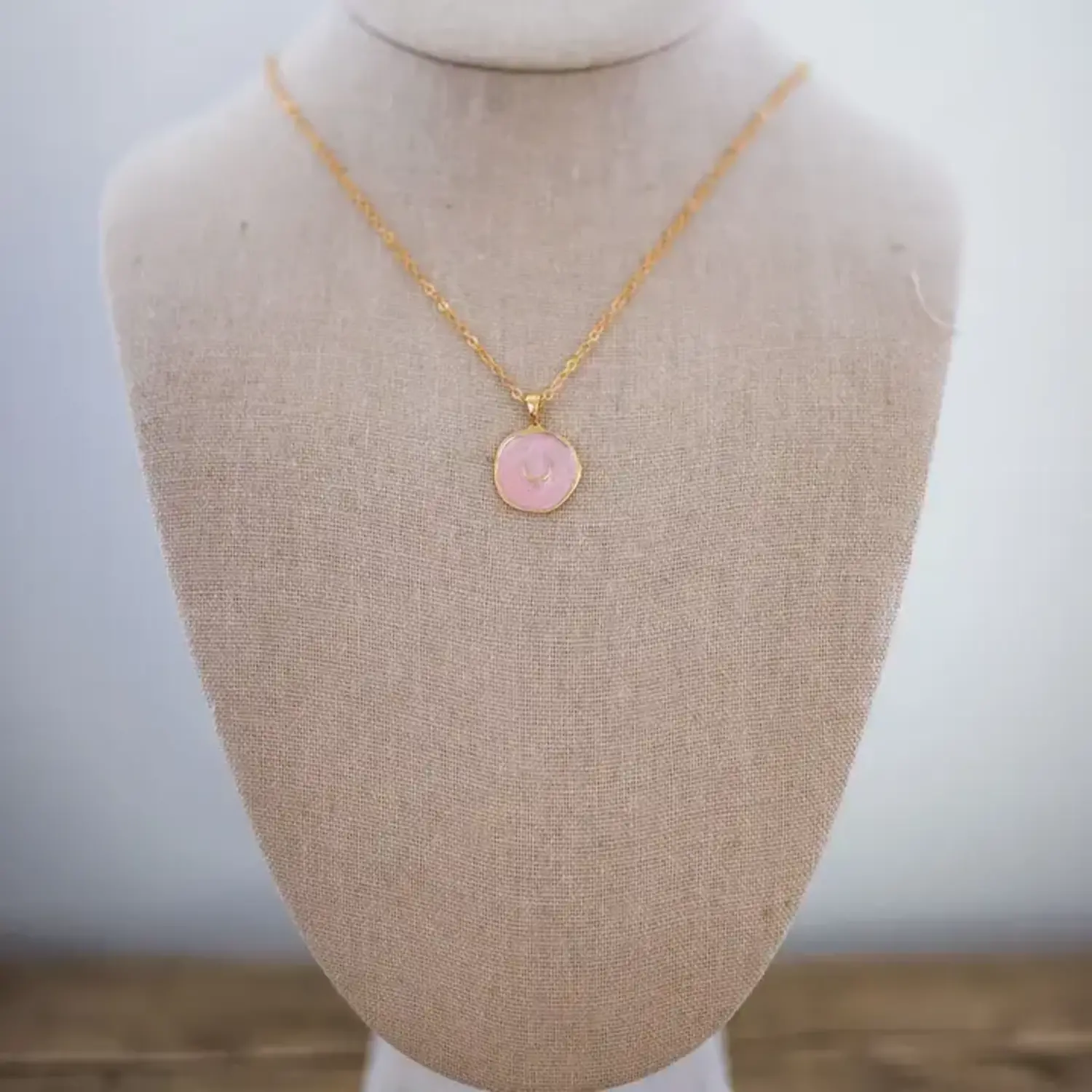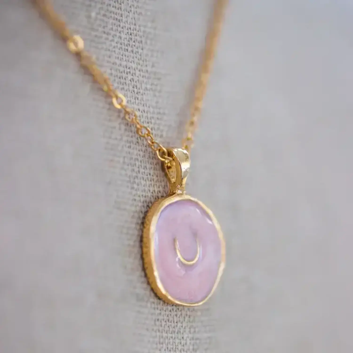 Make a statement with this vintage-inspired piece! Featuring a gold chain with pale pink enamel pendant encompassing a gold horseshoe.