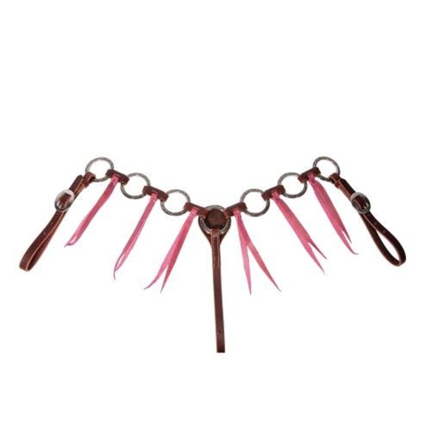 This pony breast collar brings a little flair to the ride with emerald or orchid leather tassels tied through nine beveled stainless steel rings. Burgundy leather keeps the look grounded, while the tassels add color and movement without getting in the way. ¾” leather tugs with stainless steel buckles make it easy to adjust for a good fit.