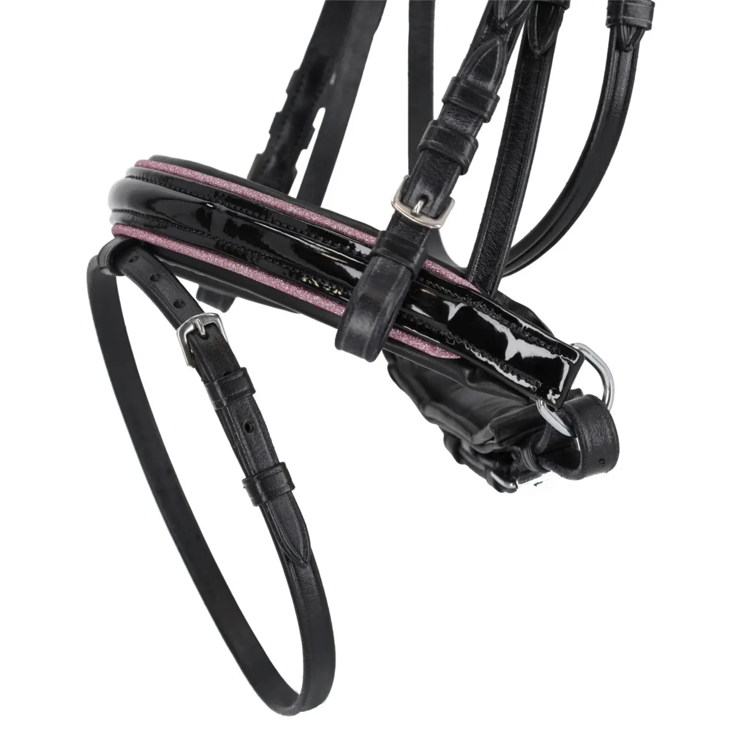 - Black leather bridle with a patent leather noseband, featuring a glitter edge