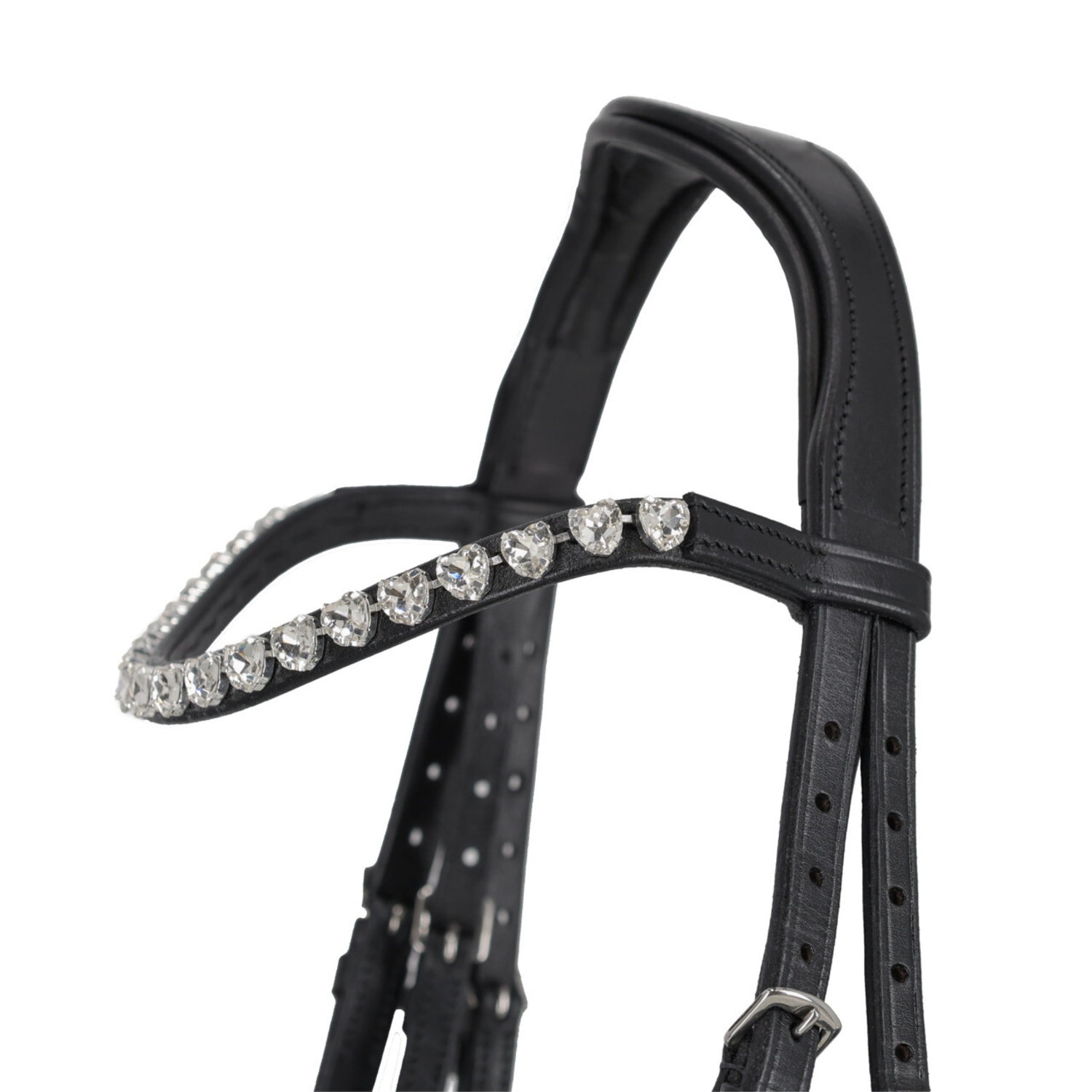 This black leather bridle features a patent leather noseband with a subtle glitter edge. The headpiece, noseband and the closure of the noseband are softly padded for extra comfort. The browband is adorned with heart-shaped rhinestones, giving the bridle an elegant look. The anatomically padded headpiece ensures a better fit and more comfort for your pony.