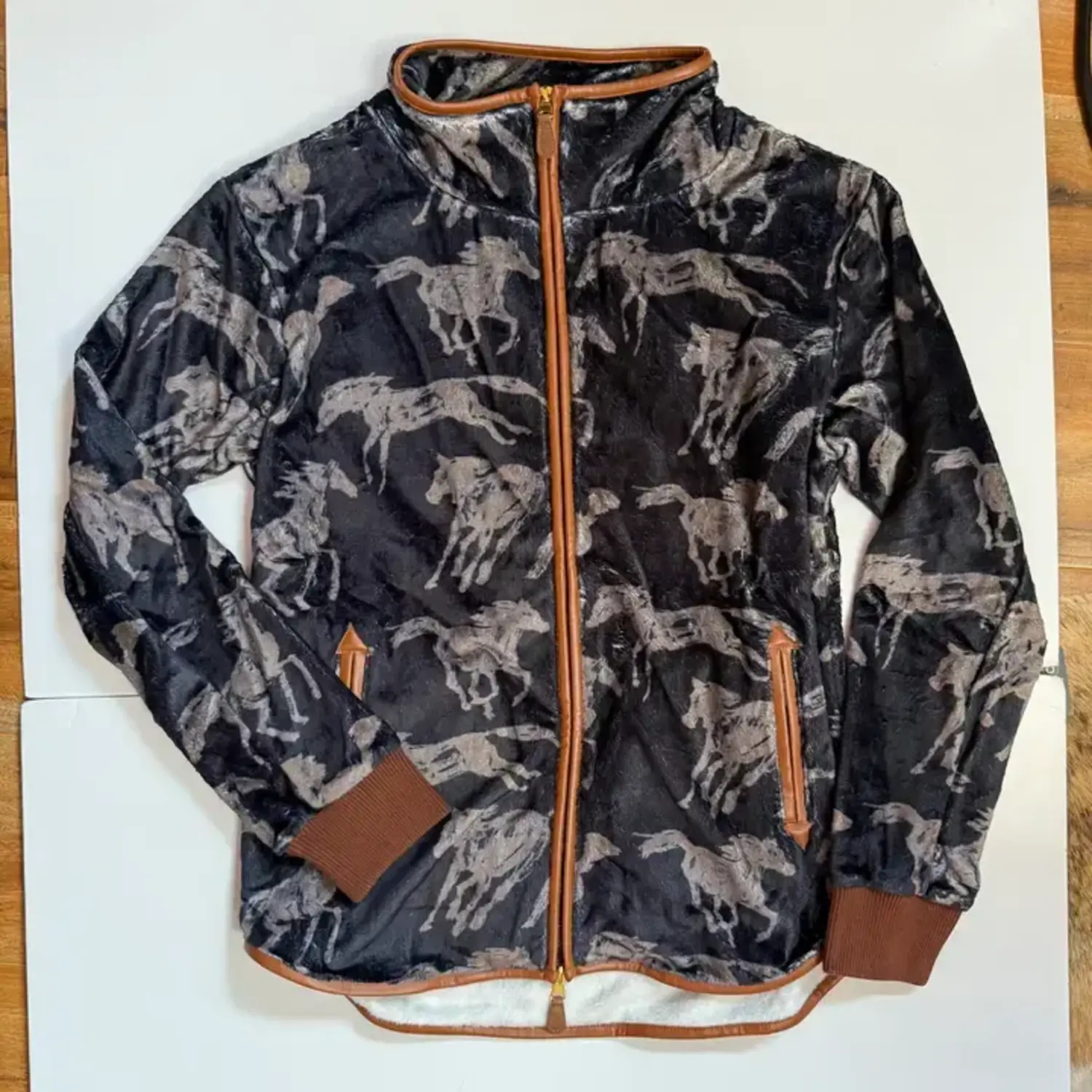 Soft, fur-textured polyester fleece featuring an all-over horse print. The long cozy cut of this jacket will keep you warm and comfortable no mater how early your show schedule gets you up. Two way zipper lets you hop on your horse without losing that body heat. Soft faux leather trim dresses up this already stylish piece.