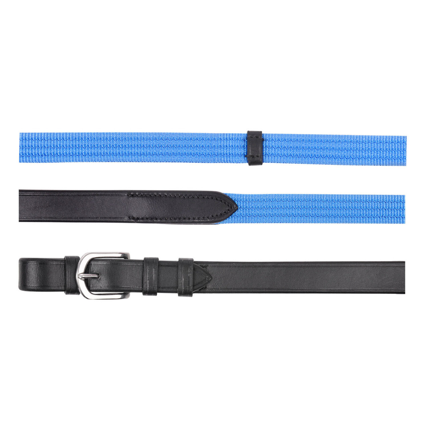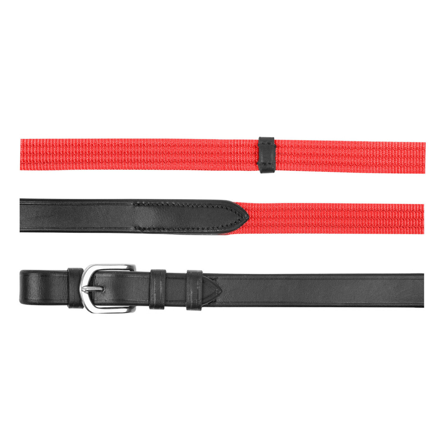Web reins with leather grips and martingale stops.