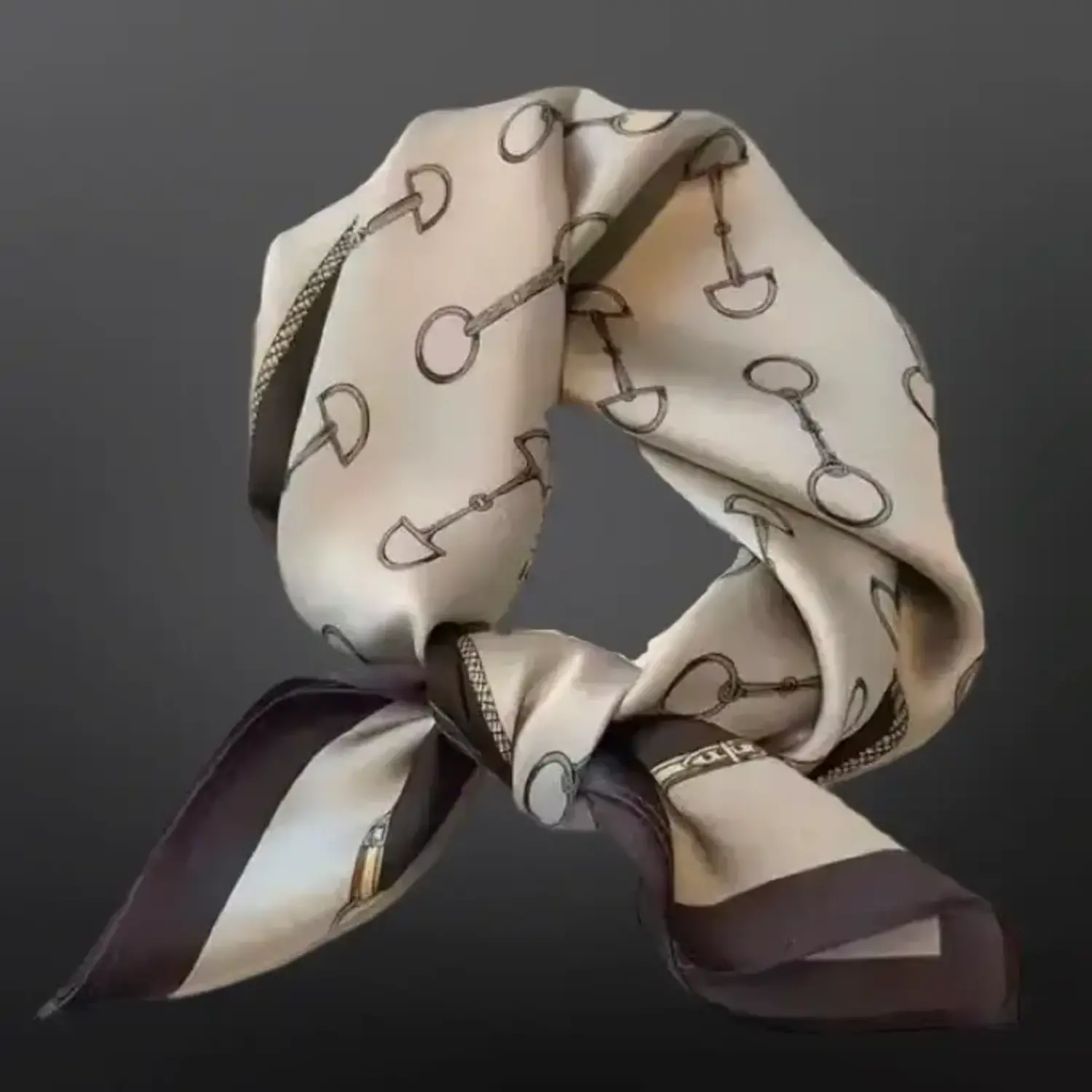 Elevate your look with this luxurious equestrian silk scarf, a timeless accessory that blends elegance with heritage. Crafted from smooth, lightweight genuine silk, it features a striking snaffle bit pattern—a nod to classic equestrian style, framed by a bold border that adds structure and sophistication. It’s a beautiful steel gray with black border. Versatile in design, this scarf can be draped over the shoulders, tied effortlessly around the neck, or styled as a chic headscarf, making it the perfect companion for both arena days and city evenings. The silky sheen and fluid drape give it a polished finish, while the equestrian-inspired motif celebrates a lifestyle rooted in tradition and refinement. 100% Silk, measures 53x53cm (20.866“ square) Note: Scarf shown on model appears larger than actual size.