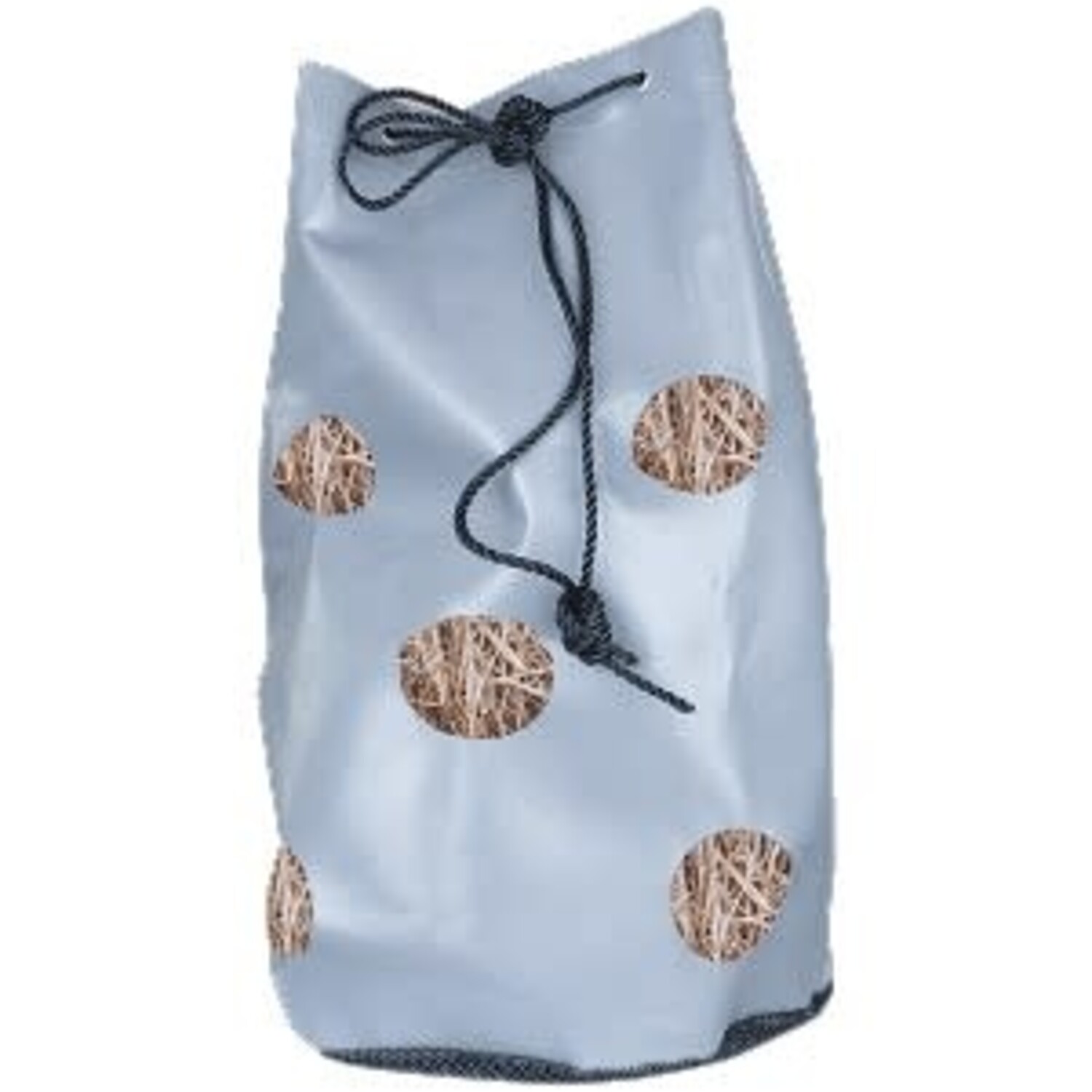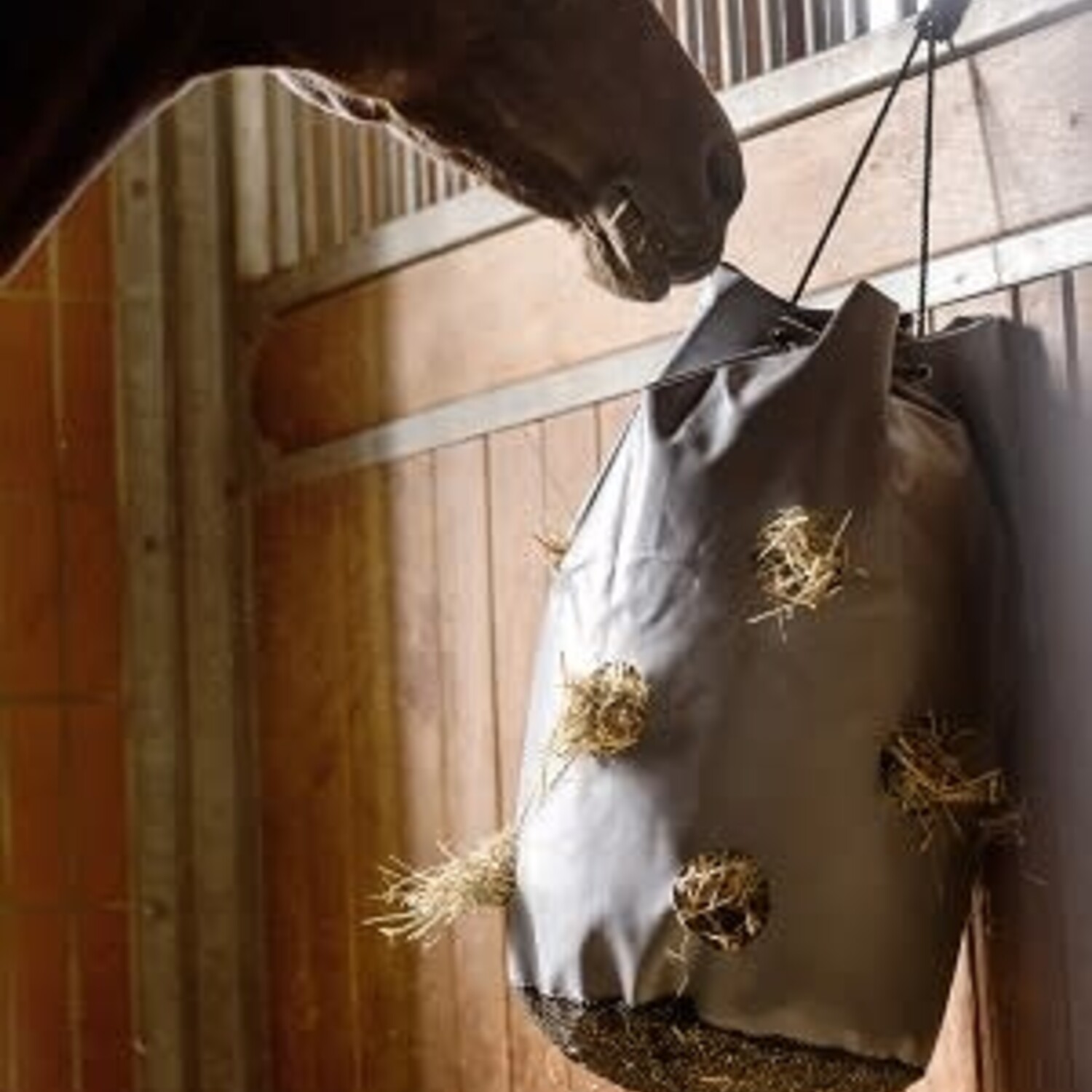 The hay bag offers an optimal solution for healthy and sustainable feed intake. With 12 holes with a hole diameter of around 8 cm, it promotes slow, horse-friendly feeding, which prevents injuries to the horse"s mouth thanks to the smooth material surface. The Haybag from Waldhausen is easy to fill and clean, reduces hay wastage and dust pollution and ensures that dust and water can fall out through the mesh floor. This means your horse breathes in less hay dust and can also be watered if necessary. Universally applicable and easy to attach, the hay bag combines many advantages in one product and contributes to healthy and clean feeding. Capacity: 85 litres / approx. 4 kg