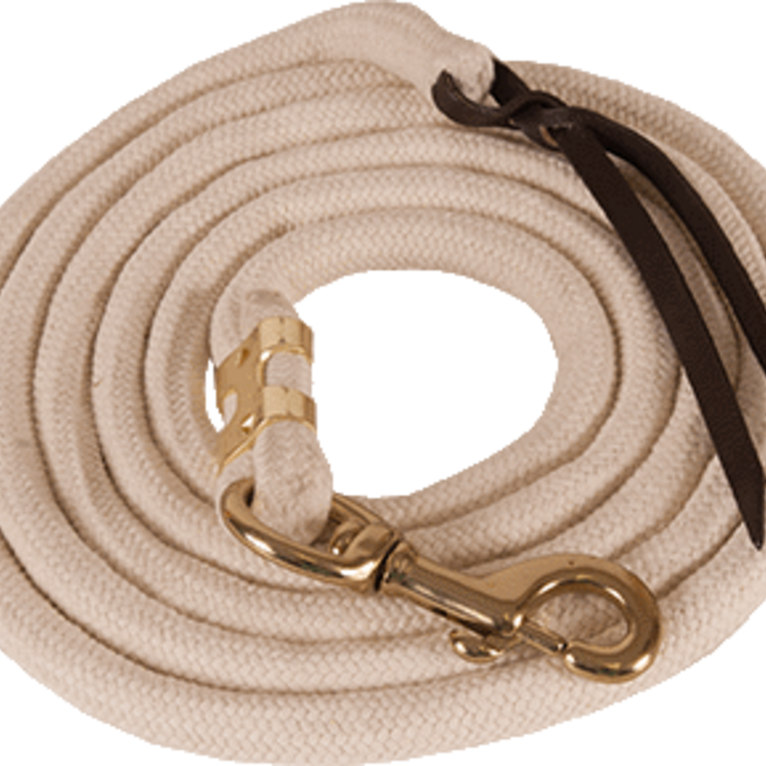Size:5/8" x 10' 5/8" x 10' pima cotton lead rope with brass plated bolt snap and leather popper end. Pima Cotton is considered to be the superior blend of cotton and is extremely durable.