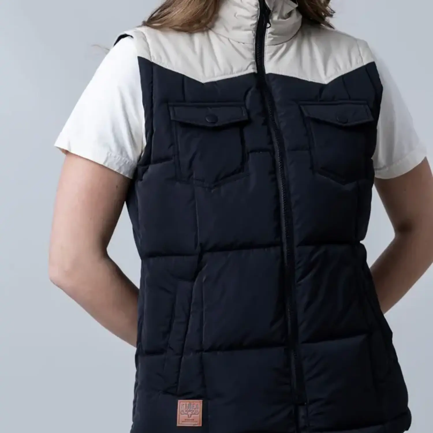 Details: Puffer Style, Color Blocking, Full Zip Front with Tapered Bottom Opening, Double Flap Snap Button Chest Pockets, Double Hand Pockets, Western Yoke, Leather Patch Kimes Ranch Logo At Hem